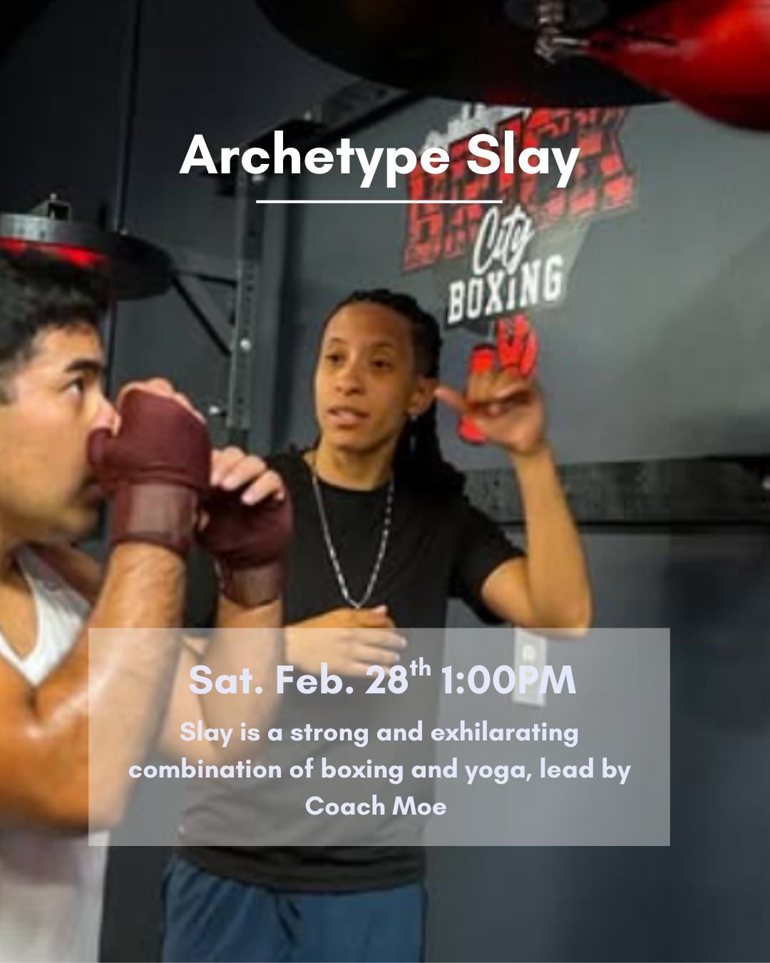 🥊 Archetype Slay — Saturday, Feb. 28th 1:00 PM - Slay is a strong and exhilarating combination of boxing and yoga, lead by Coach Moe